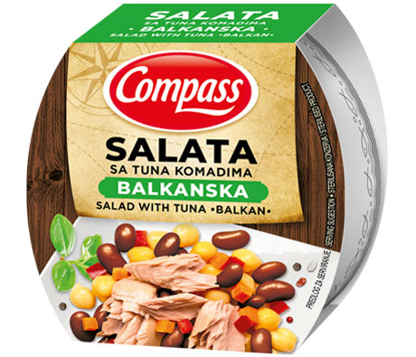 Sastojci: povrće u promenljivim udelima 68,8% (pasulj, leblebije, paprika, šargarepa), tunjevina 26%, suncokretovo ulje, so, začini.